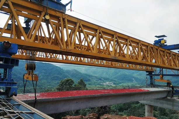 此台160吨架桥机承担着横岭咀1#桥、横岭咀2#桥及潮蓝寨特大桥共250榀箱梁架设任务,首片架设的箱梁长25米、宽2.85米、自重达76吨,位于横岭咀2#桥。自2020年3月底开始,经过现场拼装人员的连续作战,于4月21号验收合格,并具备架梁条件。该架桥机的投入使用进一步加快了项目的建设速度。